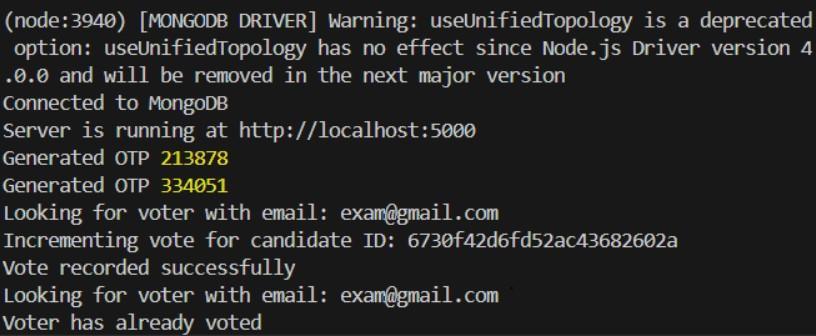 TheFigure6showsadeprecationwarningforuseUnifiedTopology,successfuldatabaseconnection,andserveroperation atlocalhost:5000.ThesystemgeneratesdynamicOTPs(213878,334051)toauthenticate votersbeforeallowingthemto vote. A voter (exam@gmail.com) successfully cast a vote, incrementing the count for a candidate (6730f42d6fd52ac43682602a). When the same voter attempted to vote again, the system detected and blocked the duplicate attempt. This ensures secure authentication, prevents multiple voting, and maintains election integrity, confirmingafair,transparent,andtamper-proofprocesswhileleveragingunifiedtechnologyforefficiency.