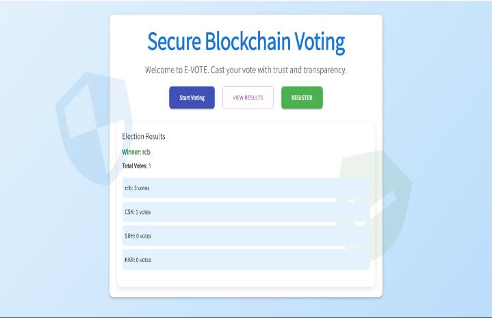 TheFigure7 showsthe SecureBlockchainVotingplatformdisplayingelection results.Theinterfaceallowsuserstostart voting, view results, or register. The results indicate that RCB is the winner with 3 votes, followed by CSK with 1 vote, while SRH and KKR have 0 votes. The system ensures trust and transparency in the voting process using blockchain technology.