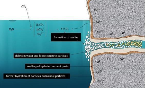 combine with free Ca²⁺ ions in the cement matrix to form calcium carbonate (CaCO₃) — a solid mineral that seals cracks.