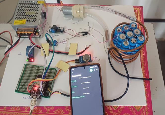 battery health through a mobile app. In case of extreme overheating or potential hazards like smoke detection, instantalertsaresenttousers,enablingpromptaction.By integrating real-time monitoring, automated cooling, and remote alerts, this smart battery management system enhances both the safety and lifespan of lithium-ion batteries. This innovation is especially valuable in electric vehicles,renewableenergystorage,industrialapplications, and consumer electronics, ensuring optimal battery performanceandreducingrisksassociatedwithoverheating