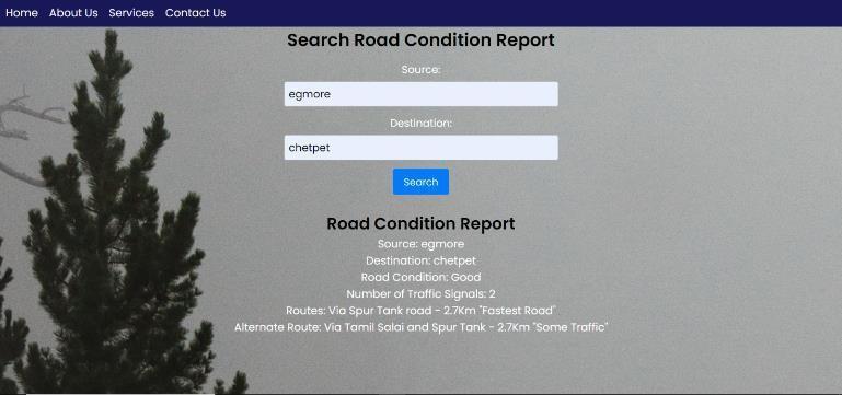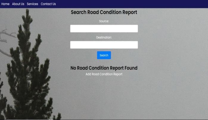 ThewebapplicationisdesignedusingHTMLandCSSto createanattractiveanduser-friendlyinterface.TheHTML isusedtocreatethestructureofthe webpages,suchas the login page, registration page, about us page, contact uspage, andservicespage.TheCSSisusedtoapplystyles, suchascolors,fonts,andlayouts,tomakethewebpages visually appealingand responsive.ThePHPprogramming language is used to establish a connection with the MySQL database to store and retrieve data. The database stores information related to road condition reports, including the source and destination information, road condition status, number of traffic