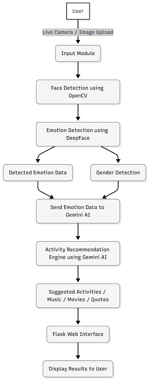 The proposed system is a Smart Emotion-Based Activity Recommendation System that detects a user's emotion through facial expressions and suggests personalized activities, music, movies, and motivational quotes. The system is implemented as a web-based application using Python(Flask framework),OpenCV, DeepFace,andGoogle Gemini AI. The design emphasizes real-time emotion detectionviawebcamandimageuploadmodeforflexibility.