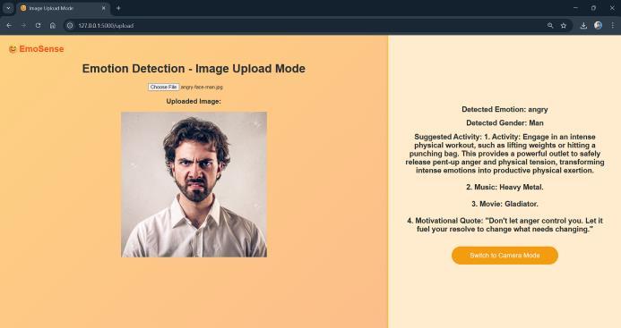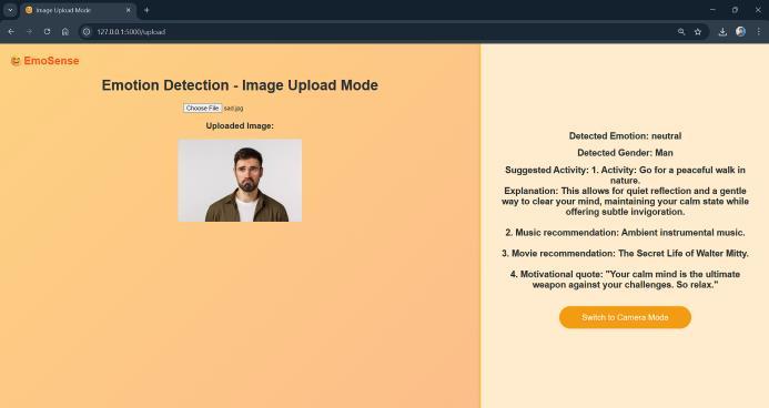 The systemsuccessfully displayed the live video feed with boundingboxesarounddetectedfacesandreal-timeupdates of detected emotions and suggested activities. Uploaded images also provided accurate detection and recommendations.