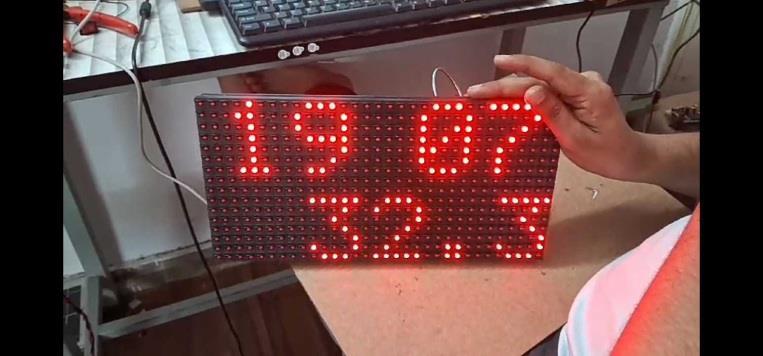 For visual output, the project uses a P10 LED display module, which is a 32×16 red LED matrix. This module is commonly used for public displays and is ideal forscrollingtextorfixeddatapresentation.Itoperateson a5VsupplyandcanbeeasilyinterfacedwiththeArduino usinglibrarieslike“DMD”or“PxMatrix.”In thisproject, it displays both the current time and temperature in a readable format, updating in real-time as the Arduino receivesnewdata.