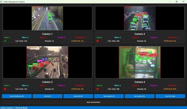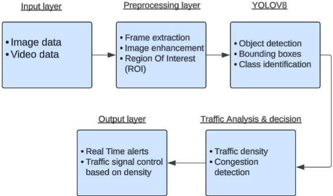 A.Vehicle Detection and Classification Module: The system beginswithreal-timevideostreamingfromawebcammodule, which transmits traffic footage to the backend. The YOLOv8 deep learning model is employed to detect and classify vehicles based on type (cars, motorcycles, buses, trucks, etc.) andtocountthemperlane.