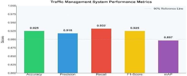 The performance of the Smart AI-Based Traffic Management Systemwas evaluated using key metrics such as accuracy, efficiency, processing time, and classification performance fordifferentvehicletypes.