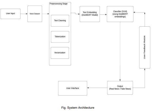 The proposed methodology centers on developing an efficient, robust, and scalable fake news detection system tailored specifically for social media platforms. By integratingtheDistilBERTalgorithmwithaSupportVector Machine(SVM)classifier,thissystemaimstoachievehigh accuracywhilemaintaininglowcomputationalcosts,making it ideal for real-time detection in dynamic environments. Thissectionelaboratesonthestep-by-stepprocessinvolved indesigningandimplementingthissystem.