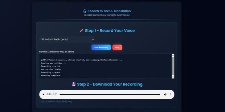 3. Audio Processing & Speech Recognition Module: This module uses Python’s SpeechRecognition library and Google’s Web Speech API to convert uploaded .wav audio into English text. It ensures accurate Automatic Speech