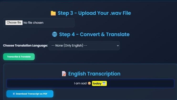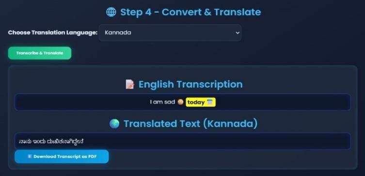 Overall,theprojectdemonstratesthatcombiningASR,NLP, and translation technologies can bridge communication gapsandprovidea moreinclusivedigital experience. With future enhancements such as advanced ASR models, improved emotion recognition, offline capability, and broader language support the system can evolve into a morepowerfultoolforeducation,assistivecommunication, andeverydayinteractionforhearing-impairedindividuals. The lightweight Flask-based architecture enables fast processing,minimal resourceusage,andeasydeployment, while features like PDF export make the output practical for real-world use. Testing showed reliable transcription accuracy for short audio clips and efficient performance acrossmodules.