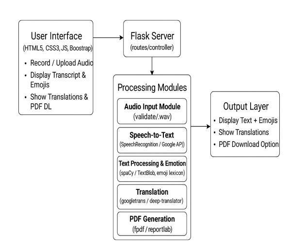 2. Backend Layer: The backend is built using the Flask framework, which manages all user requests, processes audio files, handles NLP operations, and coordinates ASR, emotion detection, and translation modules. This layer controls the data flow between audio input, text processing,translation,andPDFgeneration.