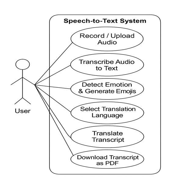 The proposed Speech-to-Text system is designed to be lightweight, modular, and highly accessible for hearingimpaired users. Its architecture ensures accurate transcription, emotion detection, multilingual translation, and smooth user interaction. To guarantee efficient operation,thesystemintegratesseveralcoordinatedlayers andtechnologies.