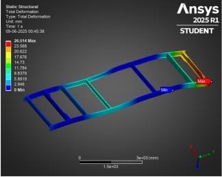 Based on the comparative analysis of different materials used for the Tata LPT 2518 chassis frame namely Structural Steel, Grey Cast Iron, Aluminum Alloy, and AISI 4140 it is evident that AISI 4140 offers the best overall performance.Itexhibitstheleastdeformation(13.852mm) while maintaining a high strength level (170.32 MPa), making it the most suitable choice for high-load and durability-critical applications. Structural Steel also performswell,showingmoderatedeformation(14.606mm) and high strength, making it a reliable and cost-effective optionforgeneralchassisdesign.Incontrast,GreyCastIron andAluminumAlloy,thoughlighterinweight,demonstrate significantlyhigherdeformationsof26.514mmand41.226 mmrespectively.Thismakesthemlessidealforapplications where structural stiffness and dimensional stability are critical.AluminumAlloy,whileofferingsubstantialweight savings,compromisesonrigidity,limitingitseffectivenessin heavy-duty structural applications. Hence, AISI 4140 is recommendedastheoptimalmaterialchoiceforensuring strength,stiffness,andlong-termperformanceofthechassis frame.