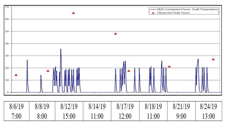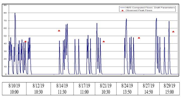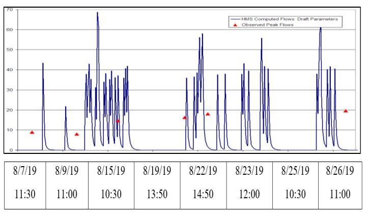 Using collected flow monitoring data from four locations distributedacross theMunicipality,aneffortwasmade to CalibrateModelFlowstomeasurevalues.Thegraphsbelow show how the measured peak flows compare to the uncalibratedHEC-HMSmodel.Aperfectcalibrationwould show the highest value (peak) between two observation points equal to the observed Peak Flow. A tabular descriptiononeachfiguresummarizestheresultsbybasin. The HEC-HMS model in the Basin underestimated the greater peak flows but matched well for the lesser rain events.Herearethespecifics.