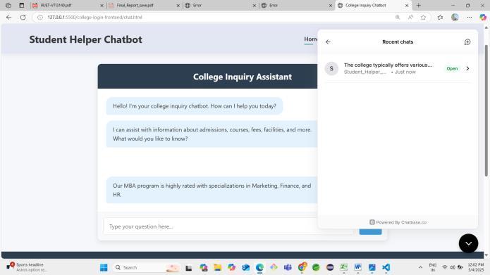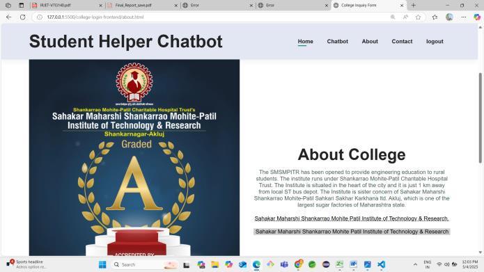 Inadditiontoenhancingtheuserexperience,theintegration of this AI-driven chatbot contributes significantly to improvingtheusabilityandefficiencyofthecollege’sonline resources. The chatbot can answer frequently asked questionsinreal time,guidestudentsthroughapplication processes, and reduce the need for human intervention, whichcanbeespeciallyhelpfulduringpeakperiodssuchas applicationdeadlinesorenrollmentseasons.