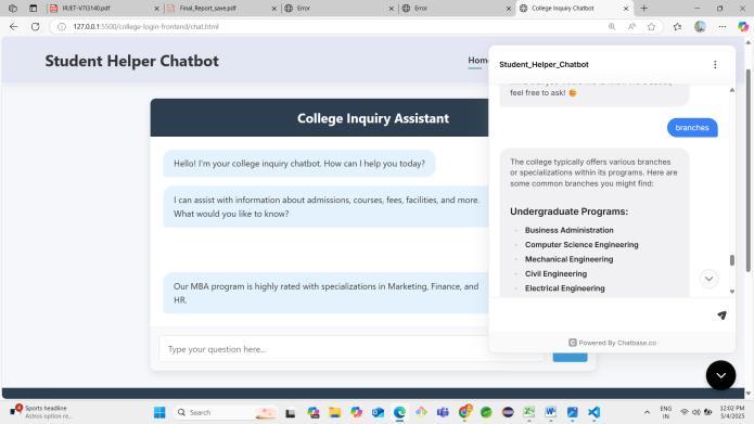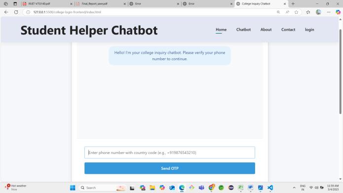 Thecollegeadmissionsprocesshaslongbeenacomplexand time-consuming task, both for prospective students and collegestaff.Withanincreasingnumberofstudentsseeking information on courses, admissions criteria, scholarships, and campus facilities, the pressure on traditional support resourceshasneverbeenhigher.Collegewebsites,although providing valuable resources, are often insufficient in managingthegrowingvolumeofinquiriesinanefficientand timelymanner.Asaresult,theexistingsupportstructures are stretched thin, making it difficult for college staff to addressallinquiriesinatimelyandpersonalizedmanner. Thisimbalancecanleadtofrustrationamongstudentsand increasedworkloadsforcollegestaff.