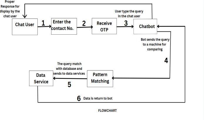 Theuserjourneybeginswhentheindividualinitiatescontact byenteringtheirphonenumberintothesystem.Following this, the system triggers a One-Time Password (OTP) verification process, sending a unique code to the user's device, which they must enter to proceed. Once authenticated,theuserispresentedwithachatbotinterface where they can type in their query. This input is then forwarded by the chatbot to a backend processing unit or machine, which analyzes the query through pattern matching mechanisms. By comparing the input against a structured database or external data services, the system identifies the most relevant information. The matched resultsarethenreturnedtothechatbot,whichformulatesan appropriate and understandable response. Finally, the chatbotdisplays thisresponseto theuser, completingthe interactioncycle.