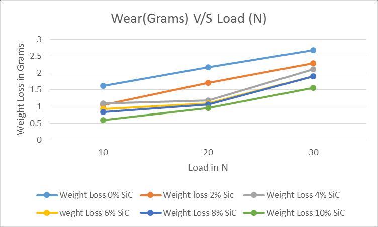 1. In sand abrasive test, the results depicts that, for all threeloadconditions,weardecreasesasthepercentage of SiC reinforcement increases. This indicates that adding SiC particles improves wear resistance of the material.Thehighestwearisobservedacrossallloads, with maximum wearunder 30N load. Wear islowest underthe10Nload.However,evenathigherloads,the presenceofSiChelpsinreducingwearcomparedtothe unreinforcedspecimen.