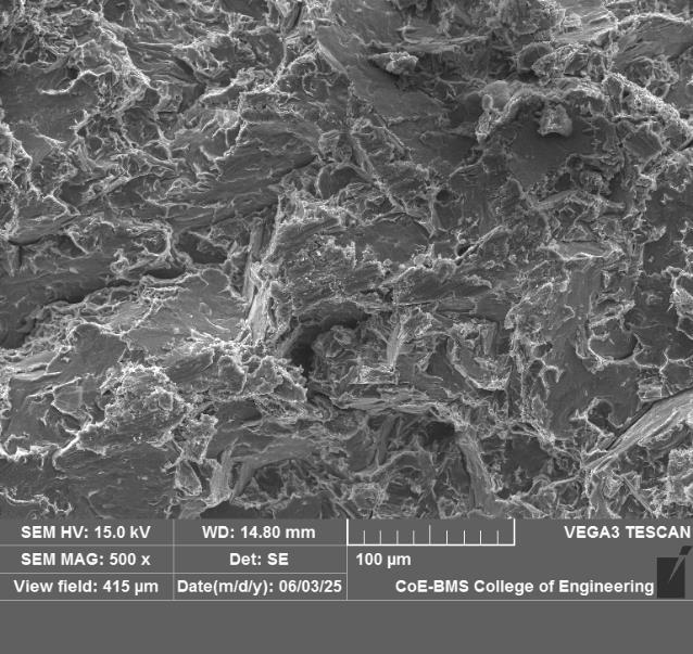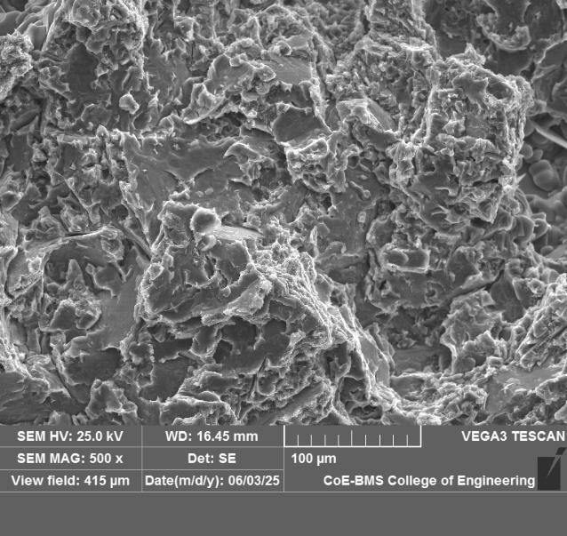 Further the SEM images of the fractured surfaces are also conducted at 500X to study the micro structure characterization to assess particle distribution, micro cracks and phase of solidification.