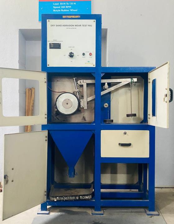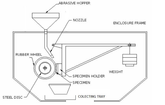 Threebodydrysandrubberwheeltestsetuphavearotating rubberwheelorsteelpressesagainstthetestspecimenand dry sand poured in between them at a constant flow rate. This makes the test specimen to wear in the form of fine particle.Afteratimeinterval,theweightdeferenceisnoted downandtabulated.