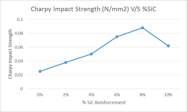 percentage. From 0% to 8% SiC, there is a noticeable increase in impact strength, the impact strength steadily increases and peaks at 8% SiC. This suggests that SiC reinforcementup to8% enhancesthe material'sabilityto absorbimpactenergy.At10%SiC,theimpactstrengthdrops sharply,thisreductioncouldbeduetobrittlenessinducedby excessive SiC content, leading to a decline in toughness. OptimalSiCreinforcementforimpactstrengthisaround8%, wherethematerialachievesitshighesttoughness.Beyond 8%, further reinforcement reduces impact strength, likely duetoincreasedbrittleness.TherelationshipbetweenSiC% andimpactstrengthisalmostlinear,withanoptimumpoint at8% followedbyadecline.