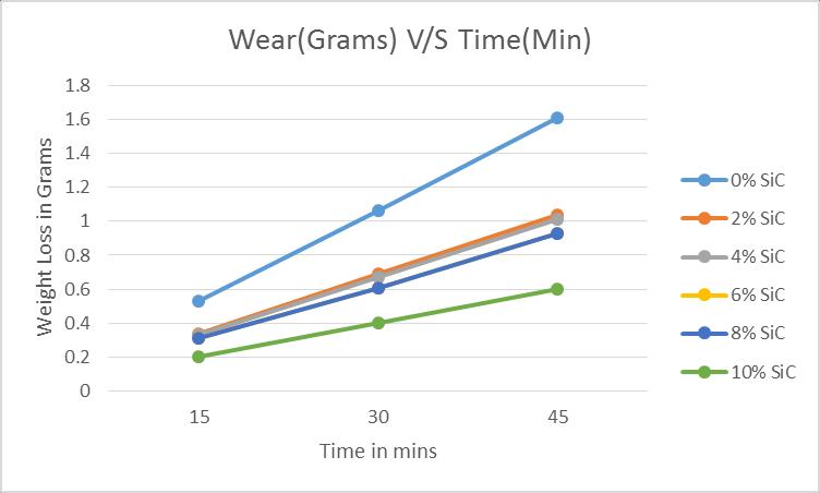 2. ThesandabrasivetestresultsalsoindicatesWeightLoss and Time for materials reinforced with varying percentages of SiC. For all SiC reinforcement levels, weightlossincreaseswithtime(from15to45minutes). Longertestdurationsresultinhighercumulativewear. 0%SiC(unreinforced)showsthehighestweightlossat every time interval. 10% SiC consistently shows the leastweightlossacrosstimeintervals.Wearisdirectly proportional to time of exposure to wear conditions. Higher SiC reinforcement significantly reduces wear, even over extended durations. This highlights the effectivenessofSiCinenhancingthedurabilityandwear resistanceofthematerial.