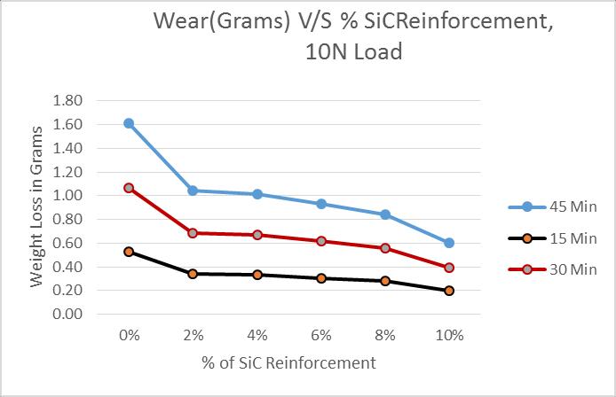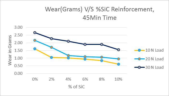 Thefigure6.1showstheplotsbetweenWearingramsV/S %SiC reinforcement for 15 min, 30 min and 45 min is as shown in diagram, the plot indicates as percentage of SiC increases, the wear decreases. This is due to increase in percentage of SiC induces the brittleness and reduces the wearofmaterials. Also15minlineisatthebottomand45 minlineattopindicateswearincreasesastimeincreases. TheGraphsfor20Nand30Nloadshowssimilartrends.
