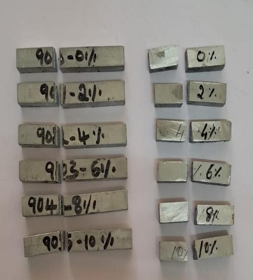 The mixture is stirred at approximately 200 RPM for 10 minutes to ensure homogeneous dispersion of the reinforcementparticles.Subsequently,themoltencomposite ispouredintosteeldiestoformplatesofthickness10mm The mouldsare allowed to cool andsolidify over 45 to 60 minutes,afterwhichthesolidifiedpartsareejected,marked according to their reinforcement percentage. Finally, the casted components are machined according to ASTM standardspecificationstoproducetestspecimenssuitablefor mechanicalandweartestingandImpacttesting
