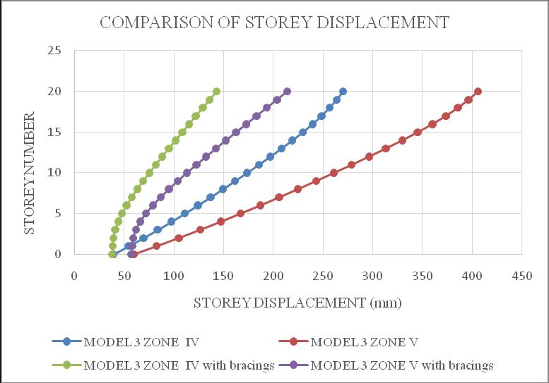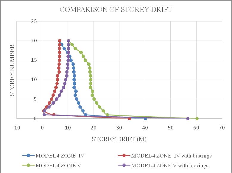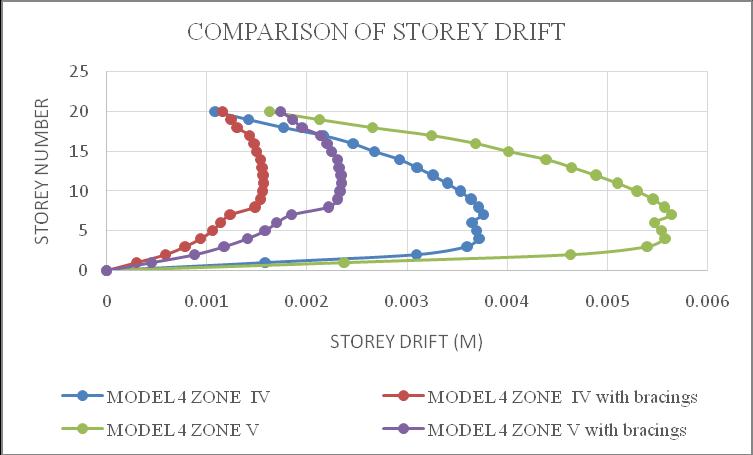 Formodel 4zone IVandzoneV with bracingsthe maximum storey drift occurs at Storey 17 with a valueof0.001044mand0.001544m.