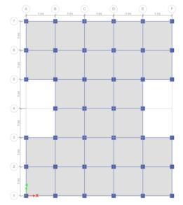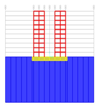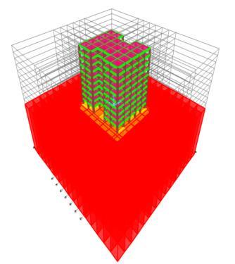 bearingcapacityof150kN/m²andadepthof30meters.To transfertheloadsfromthesuperstructuretothesoil,amat foundationwithadepthof2.5metersisprovided.Thesoil base is fixed, and surface springs are incorporated at the bottomofthematfoundationtosimulatethesoil-structure interaction. These springs represent the stiffness and dampingpropertiesofthesoil,allowingforamoreaccurate analysisofthebuilding'sbehaviourunderseismicloading.
