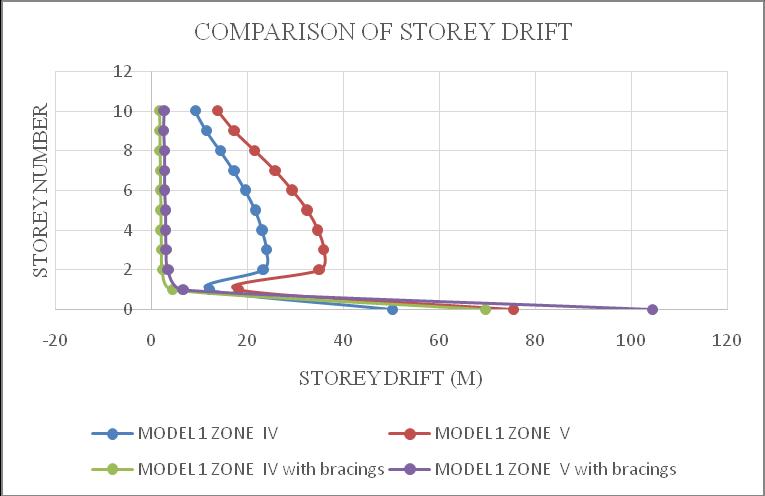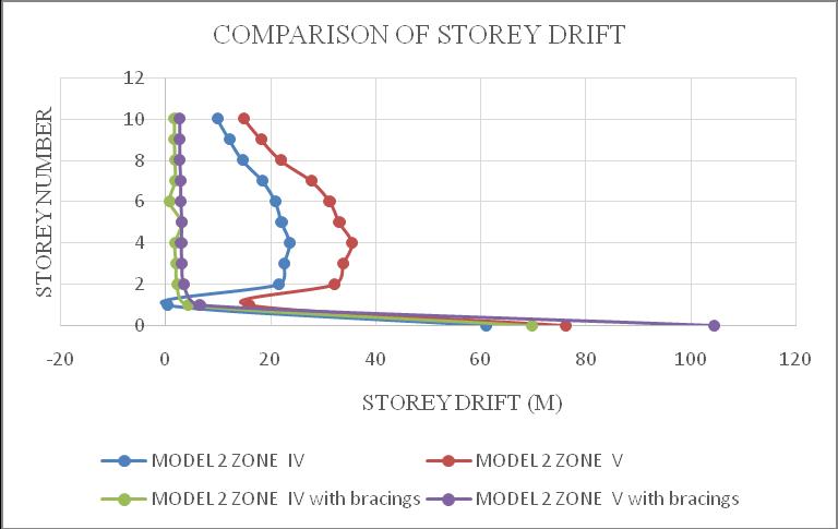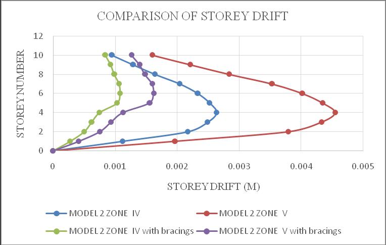 Formodel 2zone IVandzoneV with bracingsthe maximum storey drift occurs at Storey 6 with a valueof0.000791mand0.001187m.
