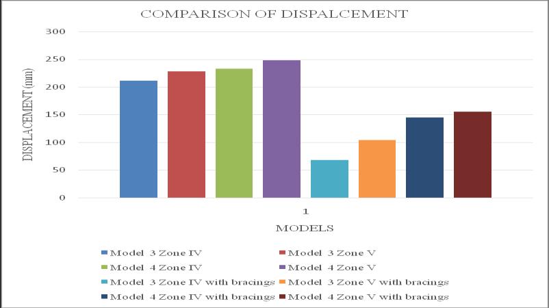 ThemaximumstoreydisplacementofthestructureisinYdirection.HencetheresultsaretakeninY-directionforzone IV & zone V with soft soil condition. Storey displacement variationsareshowninchartbelow.Fromchart1&2itcan beconcludethatbothmodel1inzoneVandmodel2inzone V isshowingmaximum storey displacement andstructure withbracingsshowsminimumdisplacement.Fromchart3& 4itcanbeconcludethatbothmodel3inzoneVandmodel4 in zone V is showing maximum storey displacement and structurewithbracingsshowsminimumdisplacement.