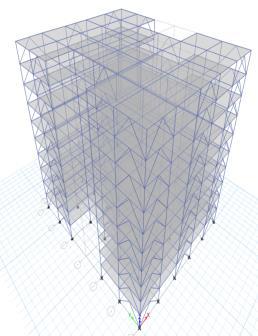 Abracedframeisastructuralsystemfrequentlyemployedin buildings that experience lateral forces, such as wind and seismicactivity.Typicallyconstructedfromstructuralsteel, the members of a braced frame are capable of efficiently handling both tension and compression. This type of constructioniswidelyutilizedduetoitscost-effectiveness and straight forward analysis. The economic advantage is derived from the pinned connections between beams and columns.Bracing,whichenhancesstabilityandcounteracts lateral forces, can consist of diagonal steel members or a concretecore.Inbracedstructures,beamsandcolumnsare designedsolelyforverticalloads,withthebracingsystem responsibleformanagingalllateralforces.Thebeamsand columnssupportvertical loads,whilethebracingsystems addresslateralloads.Inthecurrentstudy,duringpushover analysis,thestructureissubjectedtopotentialcollapse.To mitigatethisrisk,invertedVbracingsareimplemented.