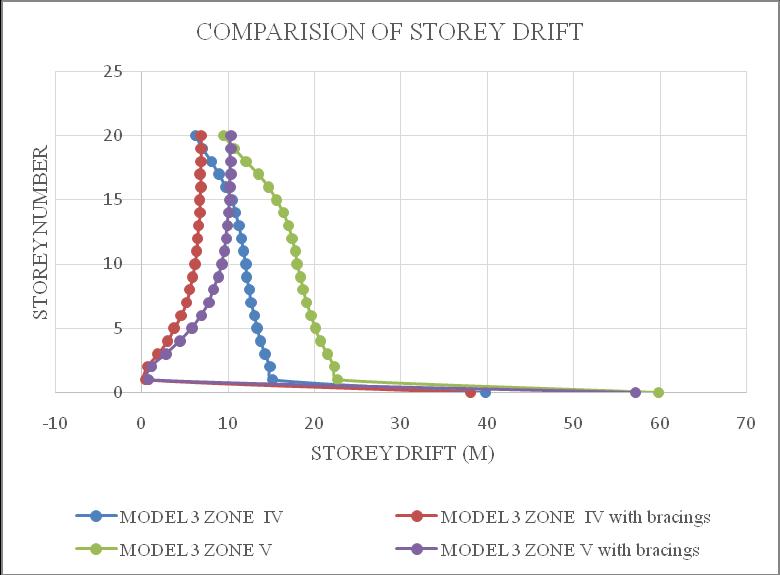 Formodel 3zone IVandzoneV with bracingsthe maximum storey drift occurs at Storey 15 with a valueof0.000805mand0.001278m.