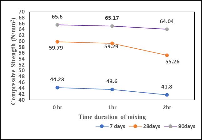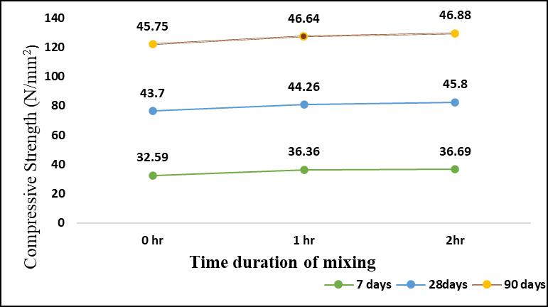 ByobservingthetwoFiguresbelow,thebehaviourofconcretewithandwithouttheadditionofadmixtureovertimecanbe understood.Fromthe referenceofthesegraphs,itisobserved thatwhenadmixturesareused,thecompressivestrength decreaseswithtime,asshowninFig4.Incontrast,theconcretewithoutadmixtureshowsanincreaseincompressivestrength withtimeduration,asillustratedinFig5.