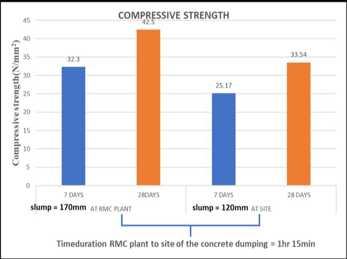 6.1 Compressive Strength Test:ThebelowFig3,showsthevariationincompressivestrengthofconcretebetweentheRMC plantandthesite.Thecompressivestrengthvaluesat7and28daysare32.3 N/mm²and42.5 N/mm²attheRMCplant,and 25.17 N/mm²and33.54 N/mm²atthesite,respectively.Thesevariationsareobservedalongwiththeslumpchangesandare basedonconsiderationsoftransportationtimeandconcretedumpingatthesite.