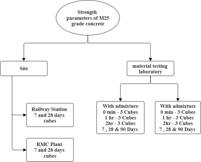 4.6 Methodology: ThisstudyinvestigatesthestrengthperformanceofM25gradeconcretethroughacombinationoffieldand laboratory testing. Standard cubes (150 mm × 150 mm × 150 mm) were cast and tested at 7, 28, and 90 days. Field investigations involved concrete site inspections at an in-situ. In the laboratory, concrete mixes were prepared with and withoutpolycarboxylate-basedsuperplasticizeradmixturesandtestedatdifferenttimeintervalstostudystrengthvariations fordetailedinvestigationshowninbelowFig1.