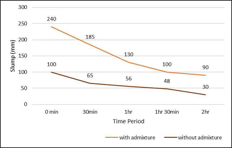 The below Fig 2 graphically compares the change in slump value (workability) over time for concrete mixes with admixture(ModifiedMix)andwithoutadmixture(ControlMix),demonstrating theadmixture'scriticalroleinslump retention