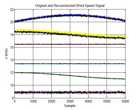 To demonstrate the high reconstruction accuracy of wind turbine data compressed using Compressed Sensing (CS) at a 75% compression rate, the results are presented in Fig-8. The original wind speed signals (colored lines) and the signals reconstructed using CS (black lines) are displayed. For better clarity, the black lines in the figures represent the original signals, while the dotted colored lines represent the reconstructed signals. These visual comparisons highlight the effectiveness of CS in maintaininghighreconstruction