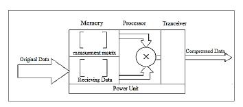 The Data Acquisition and Compression Unit (DACU) requires memory,a processor,a transceiver, and a power supply unit. With Compressed Sensing (CS) chosen as the compression method, a portion of the memory is dedicated to storing an appropriate measurement matrix. Another portion of the memory is used to store incoming data during each specified interval, corresponding to the samplingtime
