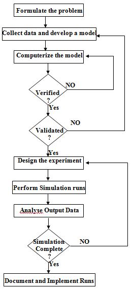 Thereare twodifferent approachesto performing all theabove-mentioned phases ofOperationsResearchDevelopment, oneisanalyticalandtheotherislogical(D.S.Hira,P.K.Gupta,2014).Thebenefitofalogicalapproachisthatwecancome upwitha solutionforthereal-worldsystemasitchangesovertime.Here, wewill findsimulationasthebestoperations research technique for such problems. Static and Dynamic simulation models are the two types of simulation. The problemsofasystemataparticularpointintimecanbeformulatedusinga static simulation model,whereasontheother hand,the problemsofa systemthatchangesovertimecanbe formulatedusinga dynamic simulation model.(Kao,1996) Theproblemswithnorandomvariablecanbeformulatedusing deterministic simulation,andthosethathaveoneormore randomvariablescanbeformulatedusing stochastic simulation.Basedonthemodelconstructedtoformulatea problem, thesimulationcanbeclassifiedintotwocategories: discrete and continuous models.Whenthedecisionvariablesvaryonly at discrete points of time, discrete simulation is applicable, and when the decision variable changes randomly over time, continuous simulation is applicable. Using a simulation model to formulate problems in which the decision variable changes in discrete time intervals is known as a discrete-event simulation model. The steps in a simulation study can be representedbyusingthefigurepresentedbelow.