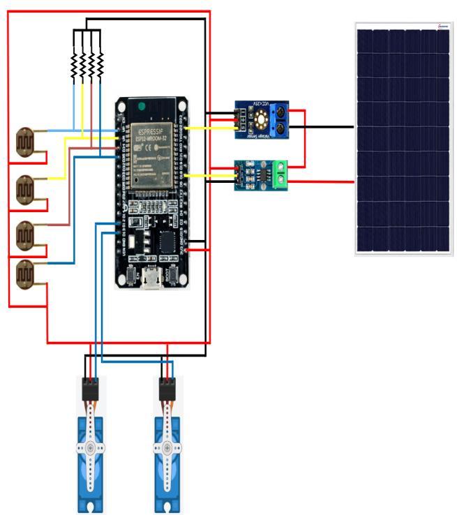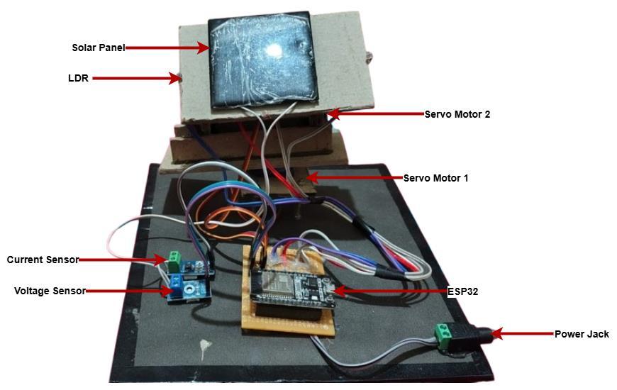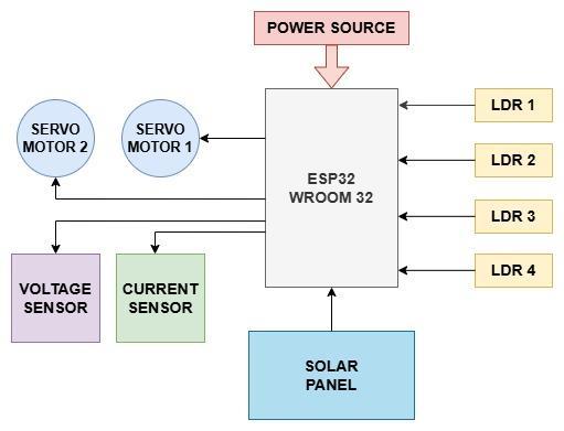 Inthisproject,theESP32collectsdatafromthe4LDRs, processes it, and controls the 2servo motors to adjust the solar panel’s position automatically. This helps maintain optimalalignmentwiththesun,enhancingthesolarpanel's energyoutputthroughouttheday.Thenvoltagesensorand currentsensorisconnectedwithoutputofsolarpanel.This istomeasurethepowerofoutputofsolarpanel.