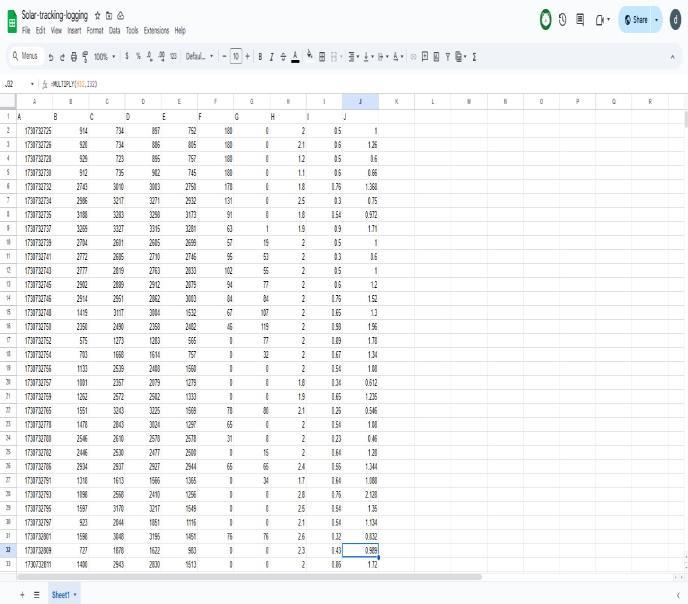 Usingmachinelearningalgorithm,thefourLDRvalues and2Servomotordirection,voltage,current,powervalues are collected in Google cloud service. Then visualize in Googlespreadsheet.Thedataisstoredeveryminutefrom controller.Thepythongivestheresultofmaximumpower consumed on direction of solar path. The output from the ESP 32 is connected to google console the 4 LDR, 2 servomotorpositions,maximumpowervaluesarerecorded