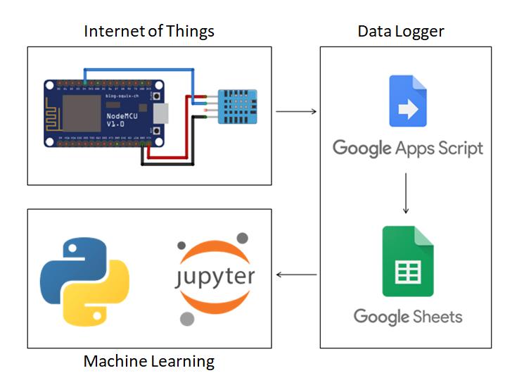 IoT,dataloggerandJupytersoftwarenetworksarelinked toperformtheoperations.