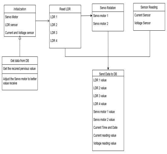 TheESP32andothersensorsareoperatedthrough5V2A Adapter.TheLDRsensorplaysthevitalroleinthisproject. The LDR sensors sense the light intensity of the solar radiation.TheValuesfromLDRsensorspredicttheposition ofsolarpanel.TheseLDRvaluesarecollectedinESP32.Then processthedataandsendthesignaltotheServomotorto rotatetheSolarpanel.TheServomotorfacestheSolarpanel direct ray from sun. Then the readings from current and voltage sensor are monitor the power efficiency. These techniqueconsumesalargeamountofpowerinSolarpanel