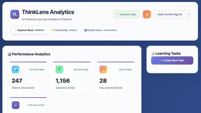 TheThinkLensAnalyticsDashboardhasbeendesignedas acomprehensivemonitoringandinteractionplatformthat prioritizestransparency,safety,andinclusiveaccesstoAIpowered learning. The system enables guardians and educators to maintain continuous oversight through realtime location tracking, ensuring user safety while preservinglearningindependence.