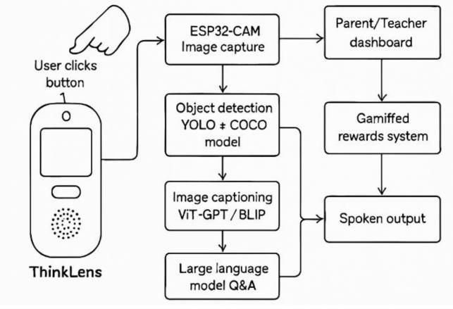 Abstract -ThinkLensisaportable,ruggedized,voice-first learning companion that integrates real-time computer vision, edge-based natural language processing, and gamified pedagogy to enable contextual learning for children,elderlyusers,andpeoplewithspecialneeds.The device addresses critical gaps in passive screen-based learning and digital literacy barriers through offlinecapable AI models optimized for educational content delivery. Our system combines object detection using quantized MobileNetV2 architectures, optical character recognitionfortextreading,andadaptivespeechsynthesis formultilingualsupport.Thehardwaredesignfeaturesan 8MP camera, Rasberry Pi, 5000mAh battery, and IP65 ruggedizedencasingtargetingaretailpriceof₹5,000.Pilot studies with 180 participants across three demographic groups over a period of 2 years, demonstrate 23% improvement in learning retention, 67% increase in technologyconfidenceamongelderlyusers,and78%ease ofaccomodationindaytodayactivitiesforspeciallyabled poeple (primarily blind people). The device also operates primarilyoffline,ensuringprivacyandaccessibilityinlowconnectivity environments while supporting 12 major Indianlanguages.