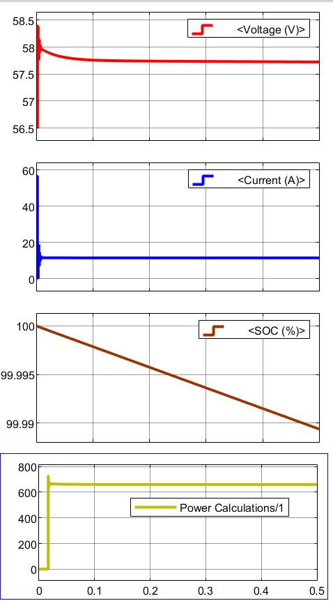 • Power Calculations: The power profile in the final graph shows a stable output, peaking at around 600 W and stabilizing at this level throughout the observation period. This consistency suggests the system is maintaining a constantpoweroutput,inlinewiththeconstantcurrentbeingdrawn.