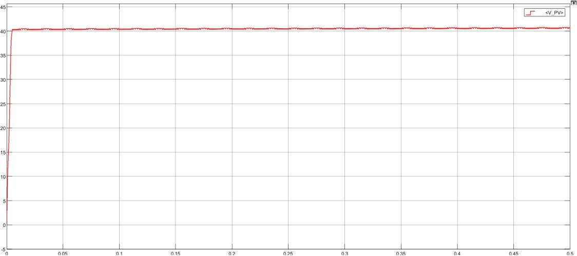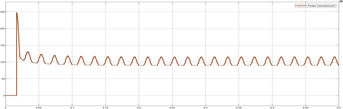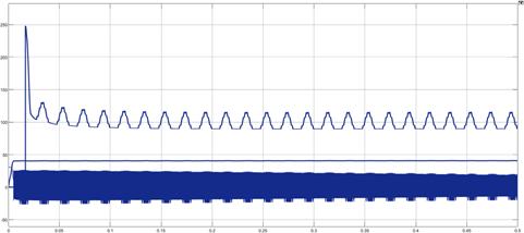 Thisgraph presentsthe PV outputvoltage and power profile.The PVvoltage stabilizesaftera short transient,indicating the MPPT algorithm's effectiveness in tracking maximum power point. the graph provides insights into the performance of the transformerless photovoltaic (PV) system. Initially, at approximately 0 seconds, there is a significant spike in the waveform, reachingover1000units.Thiscouldrepresentaninrushcurrentorvoltagesurgeduringthesystem'sstartup,likelycaused by capacitorchargingorinitialpowerfluctuations.Followingthis,thewaveformstabilizesintoperiodicoscillationswithpeaksand valleys fluctuating between 50 to 200 units. These oscillations suggest the presence of harmonic distortion, common in the inverter'soperation,whichgraduallydiminishesasthesystemadjusts.Afterabout0.4seconds,thewaveformstabilizes,with fluctuationsremainingcloseto 0 units,indicatingthatthesystemhasreachedasteady-statewithminimalharmonicdistortion. ThispatternreflectsthetransformerlessPVsystem'sabilitytohandleinitialtransients,reduceharmoniccontent,andstabilize itsoutputforoptimizedintegrationwiththeresidentialgrid.