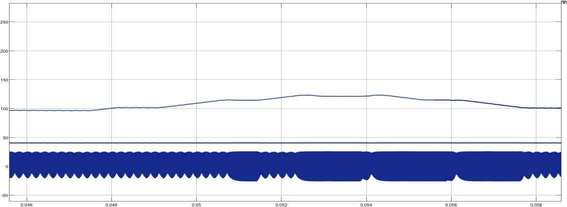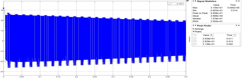 This scope shows the current output from the PV array. The graph demonstrates the PV's ability to respond to irradiance changes,withagenerallystablecurrentprofileunderload.Thenumericalfindingsfromthegraphoftheoutputcurrentprofile ofthetransformerlessphotovoltaic(PV)arrayrevealseveralkeycharacteristicsofthesystem'sbehavior.Thecurrentfluctuates betweenahighofapproximately23.17Aandalowof-13.58A,indicatingtheACcurrentproducedbythePVsystemwithsome fluctuationslikelycausedbytheinverter'soperation.Therisetimeisapproximately753.52msandthefalltimeis755.74ms, suggestingrelativelyslowtransitionsinthe output current,whichcould be due tothe inverter'sswitchingcharacteristics or filtering.Thewaveformexhibitsregularperiodicspikes,spacedabout 0.05 seconds apart,indicatingaswitchingfrequencyof around20Hz,whichistypicalforinvertersintransformerlessPVsystems.Thesloperateof417.59V/srepresentshowquickly the current is changing during each transition. Additionally, the waveform shows minimal overshoots and undershoots, indicating that the system has been optimized to reduce these distortions, ensuring a stable current output and minimal harmonicdistortion.Thesecharacteristicsarecrucialformaintaininganefficientgridinterfaceandreducingharmoniccontent inresidentialPVsystems.