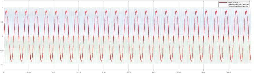 Thisplotshowsthevoltageandcurrentwaveformsattheinverteroutput.Thewaveformsaresinusoidalwithhigh-frequency switchingcomponents.Despitetransformerlessdesign,theoutputqualityismaintainedwithminimalharmoniccontent.The numerical findings from the waveform data presented in the diagram reveal key insights into the performance of the transformerlessphotovoltaic(PV)system.Inthetopgraph,thevoltageorcurrentwaveformexhibitshigh-frequencyoscillations with peaks reaching approximately 0.45 (units in volts or amperes), suggesting the presence of high-frequency harmonics typicallyassociatedwiththeinverter’soperation.Theseoscillationsoccuratregularintervals,withaperiodicityofabout0.1 seconds,indicatingpotentialfluctuationsinpowerconversion.Incontrast,thebottomgraphshowsamuchsmootherwaveform withpeaksataround0.45and-0.45,representingamorestableandcleaneroutput.Thiswaveformbehaviordemonstratesthe system’sabilitytoreduceharmonicdistortionandachieveamoreconsistentsignal.Theperiodicityoftheoscillationsremains similartothetopgraph,butthereductioninamplitudeandsmoothertransitionsindicatethatthesystemhasbeenoptimized tominimizehigher-orderharmonics,ensuringbettersynchronizationwiththeresidentialgrid.Thenumericalvaluessuggest that while initial harmonic distortion may be present, the system effectively filters out unwanted frequencies, leading to a cleaner,morestableoutputthatmeetsgridrequirementswithreducedharmoniccontent.